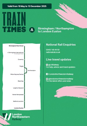 service area Commuter and regional services (London Northwestern Railway): London Euston-Milton Keynes Central-Northampton-Rugby-Coventry-Birmingham New Street/Crewe-Liverpool Lime Street. West Midlands local services (West Midlands Railway). Local services Bletchley-Bedford (until the start of East West Rail); Watford Jn-St Albans Abbey